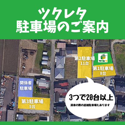 店舗前(第1駐車場)、店舗横(第2駐車場)、徒歩1分の場所(第3駐車場)に合計30台以上の駐車場をご用意しております。