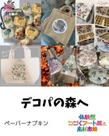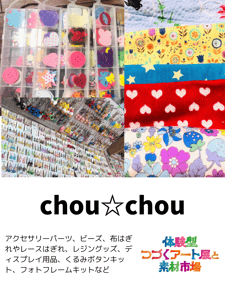 ハンドメイド作家さんを中心に、使わなくなった素材や大量に仕入れてしまったパーツ、売れ筋とならなかった材料などハンドメイドを作るための素材の販売市場を開催します。それらの素材を使ったワークショップも多数開催。