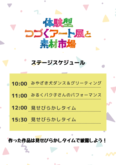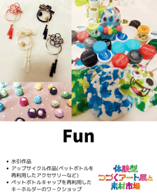 「体験型つづくアートと素材市場」は3つのことなる「つづくアート体験*」を通じて、持続型社会を自分ゴトにするイベントです。