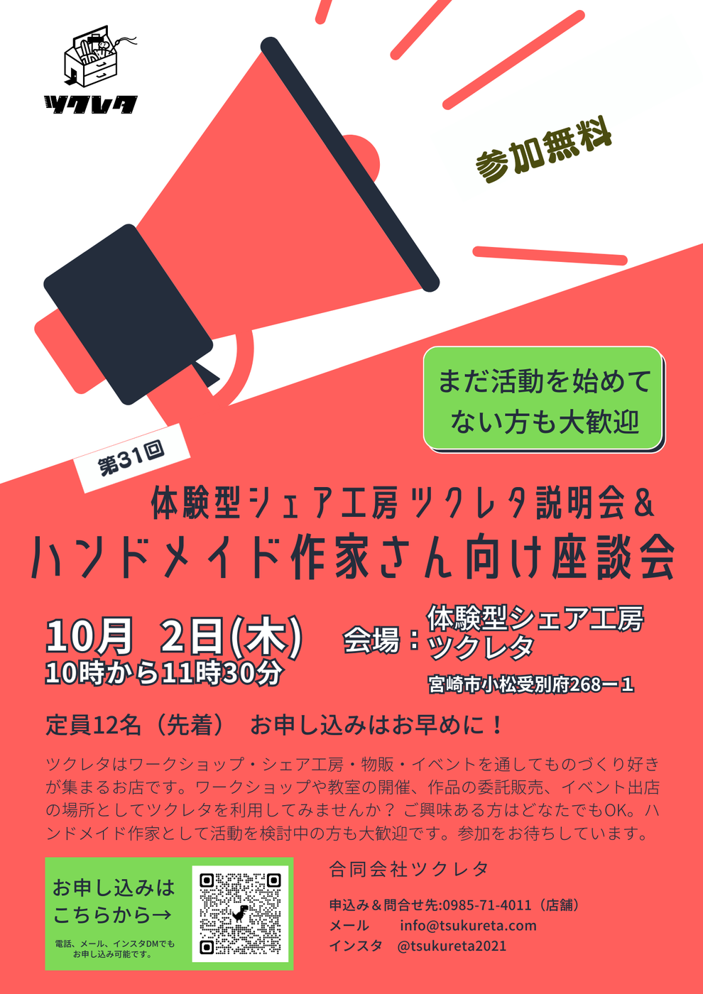 第31回ハンドメイド作家向け座談会を以下の日程で開催します!! 日付:10月2日(木) 時間:10:00〜11:30 場所:体験型シェア工房ツクレタ ツクレタでのワークショップ利用はもちろん、ハンドメイド作家を始めようとしている方からベテランの方まで、 毎回色々な方にご参加いただき、新たなつながりが生まれています。...