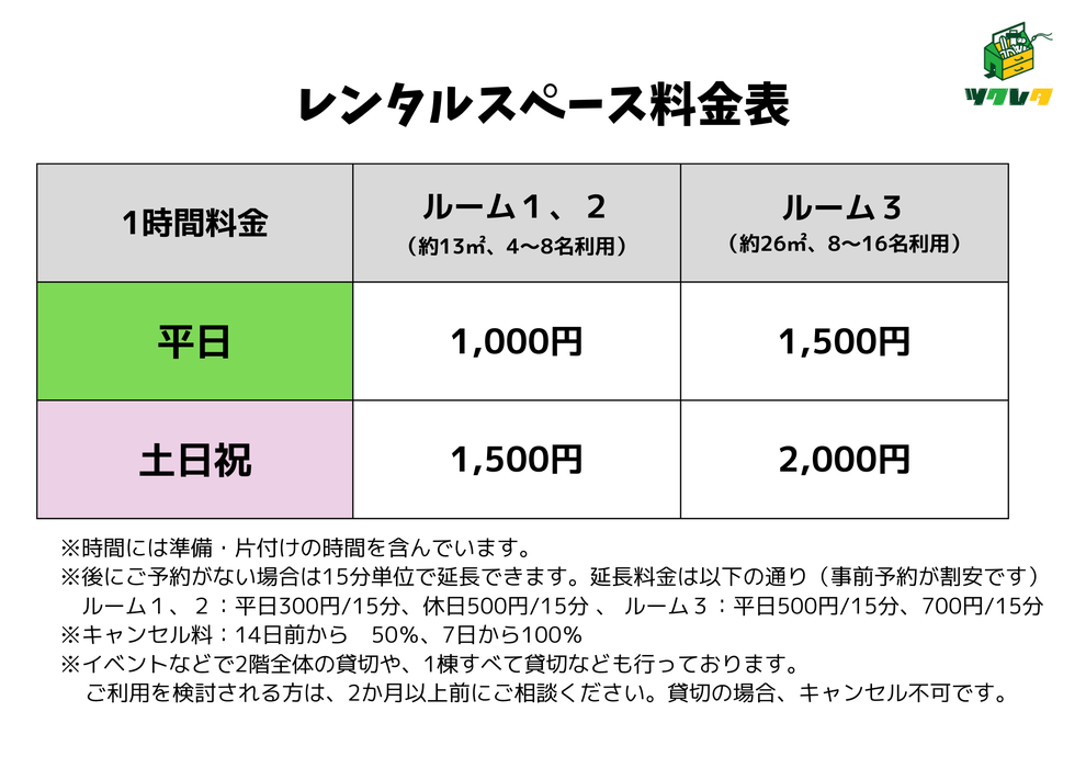 ※ご予約は「準備」と「後片付け」を含んだ時間をご予約ください。