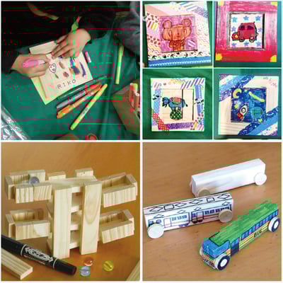 ちいさなお子様でもできる簡単なつみきパズルや、ビー玉を転がすしっかりした工作物など、宮崎杉を使った誰でもできる簡単な木工工作です。