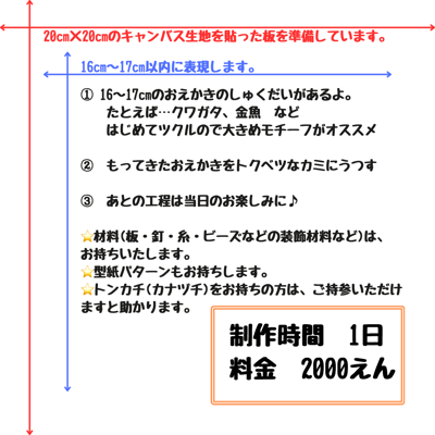 持ち物:事前にイラストを書いた紙、カナヅチ(小型ハンマー)をお持ちの方はご持参いただけると助かります(こちらでも準備しています)